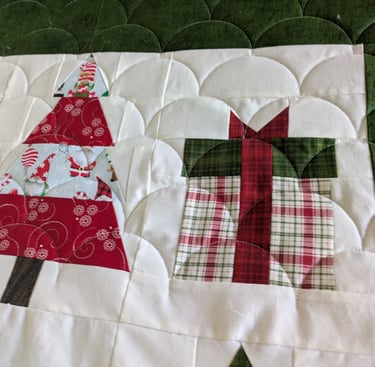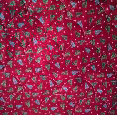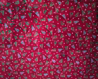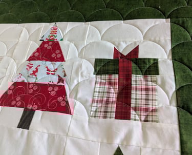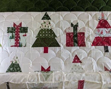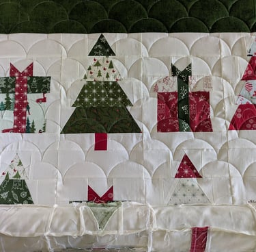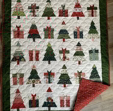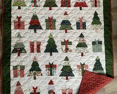 Trees, gifts and stitches. All of the holiday vibes in one quilt. Rows of patchwork Christmas trees and wrapped gift boxes dance across the surface, each one pieced from a joyful mix of red, green, and white fabrics in classic seasonal prints. This quilt evokes the excitement of a cozy Christmas morning.