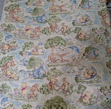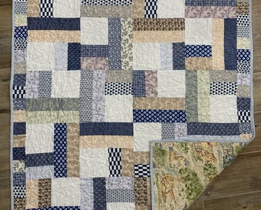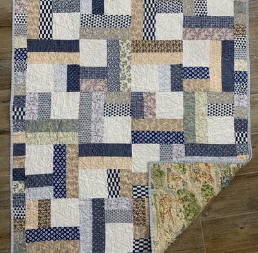 Tamara Larsen made this quilt a joyful blend of whimsy and artistry, stitched with storytelling in every seam. Its piecing mimics the look of stained glass, with each rectangular block a little window into charm. Flip it over, and you’ll find a delightful surprise: a backing fabric featuring Winnie the Pooh and friends in a scenic woodland print adding both nostalgia and warmth.